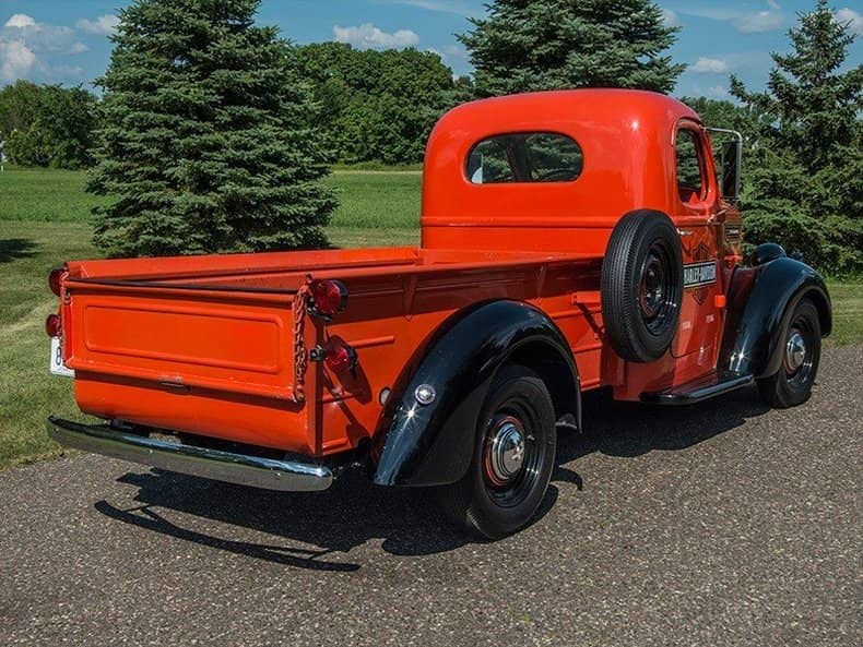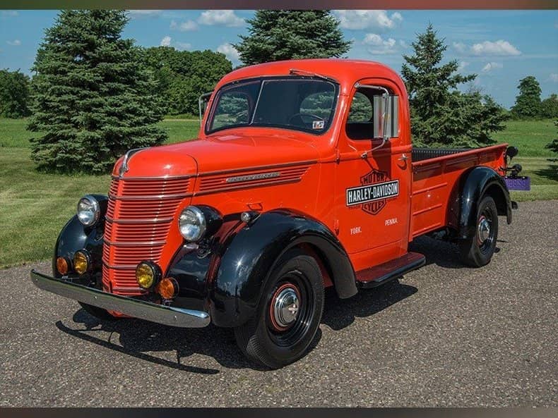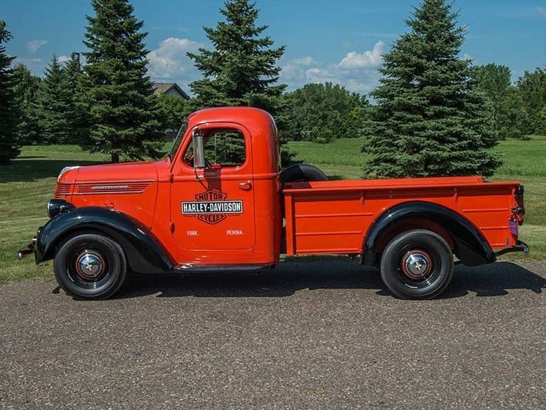 This International (IHC) D-2 half-ton pickup is a chassis and cowl model featuring a 213 CID 6-cylinder engine, which pushes out 78 horsepower in total. This truck features a black and orange paint combination with Harley Davidson branding on each side. The car is styled with a classic and artistic look, which sets it apart from most cars of the same period. World War two stripped most car makers down to bare bones in production. International’s commitment to a beautiful design is what makes it a stand-out car in today’s world.