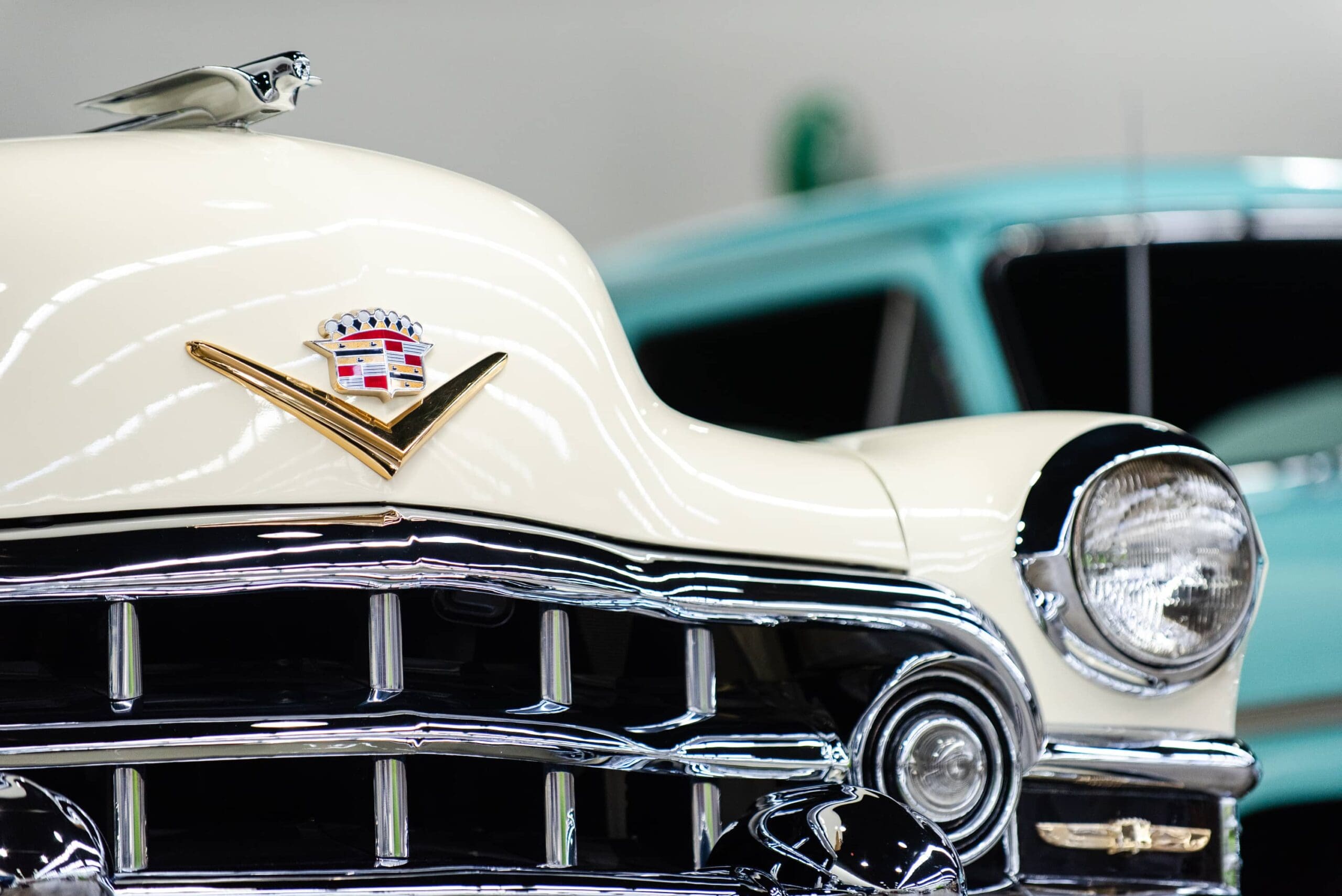 Cadillac is often remembered for the radical styling of its models by the end of the 1950s. However, the GM Division’s dramatic postwar renaissance was far more revolutionary, with the all-new bodies and styling it produced for 1948 and the dawn of Cadillac’s all-new modern overhead valve V-8 engine in 1949. Annual updates provided additional refinement, with revisions for 1950 including lower and sleeker contours, long rear decks, sweeping front fenders, and a broken rear-fender line. Cadillac’s signature “egg-crate” grille became even larger, and the hood extended out further than before, for a truly commanding visage. A modern one-piece windshield, rounded parking lights, and long, sweeping rear fenders with neat, upwardly flowing tailfins rounded out the stylistic changes.