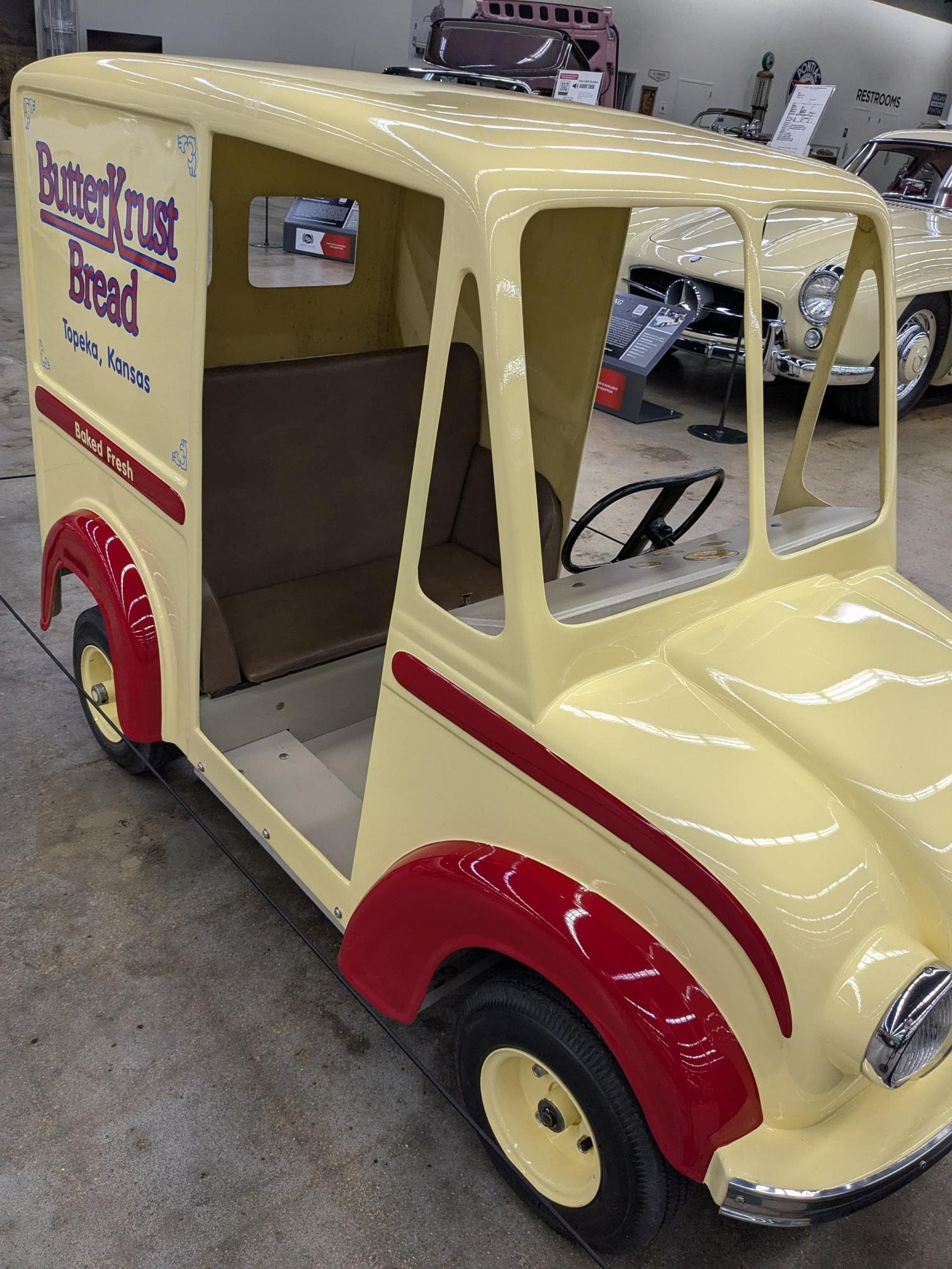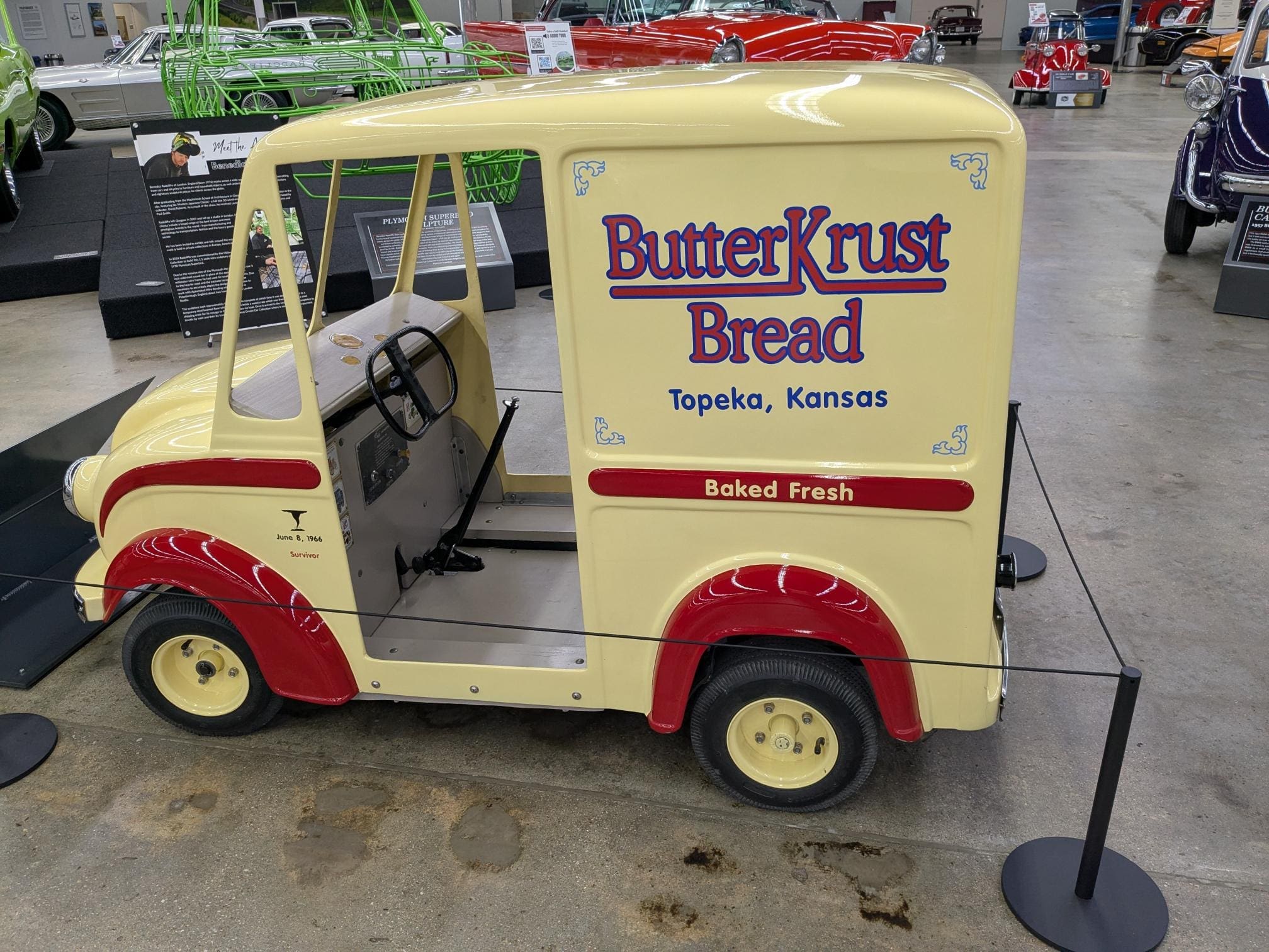 Divco (Detroit Industrial Vehicle Company) began producing delivery trucks in 1926, primarily for dairy and home delivery services. Known for their boxy shape and ability to be driven standing or sitting, Divcos became an American icon, remaining in production with minimal changes until 1986—one of the longest-running vehicle designs in U.S. history. This vehicle is a 1955 Mini-Divco. It was manufactured by the Robel Corporation in Berwick, Pennsylvania. The original power unit was a 1 ¾ horse Briggs & Stratton engine. It was originally purchased in 1955 by the Alexander Brothers’ Baking Company doing business as ButterKrust bread in Topeka, Kansas. They used it for parades, store displays and carnivals all around the Topeka area. In 1967 the company finished using it as a promotional device and decided to give it away to their Driver of the Year. From there it went through several owners. The current owners are Danny & Becky Downs. Danny purchased and did the original green & cream restoration in 1995 for his daughter. The second restoration was done in 2019, and the current color scheme was chosen to reflect its Topeka heritage and history.