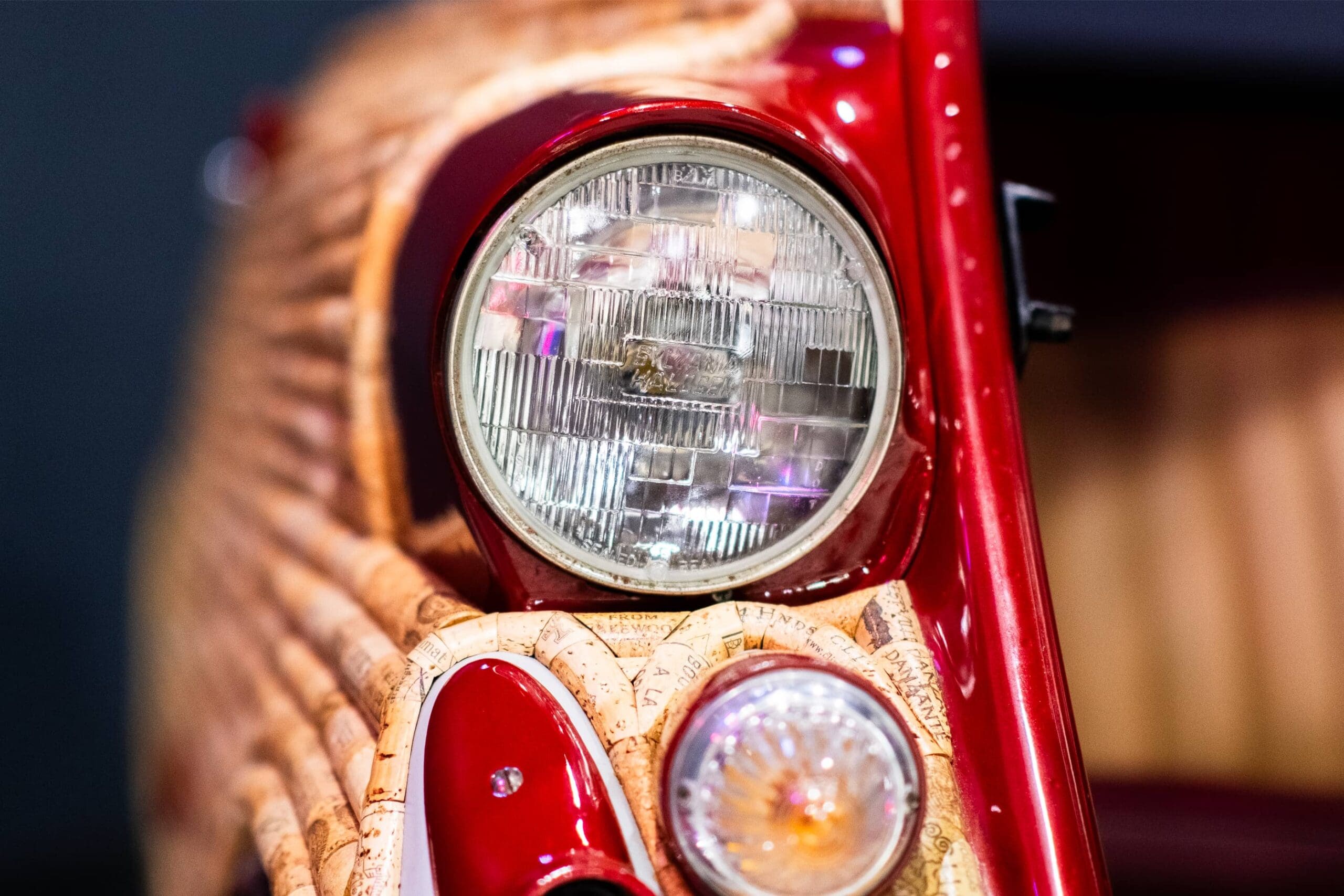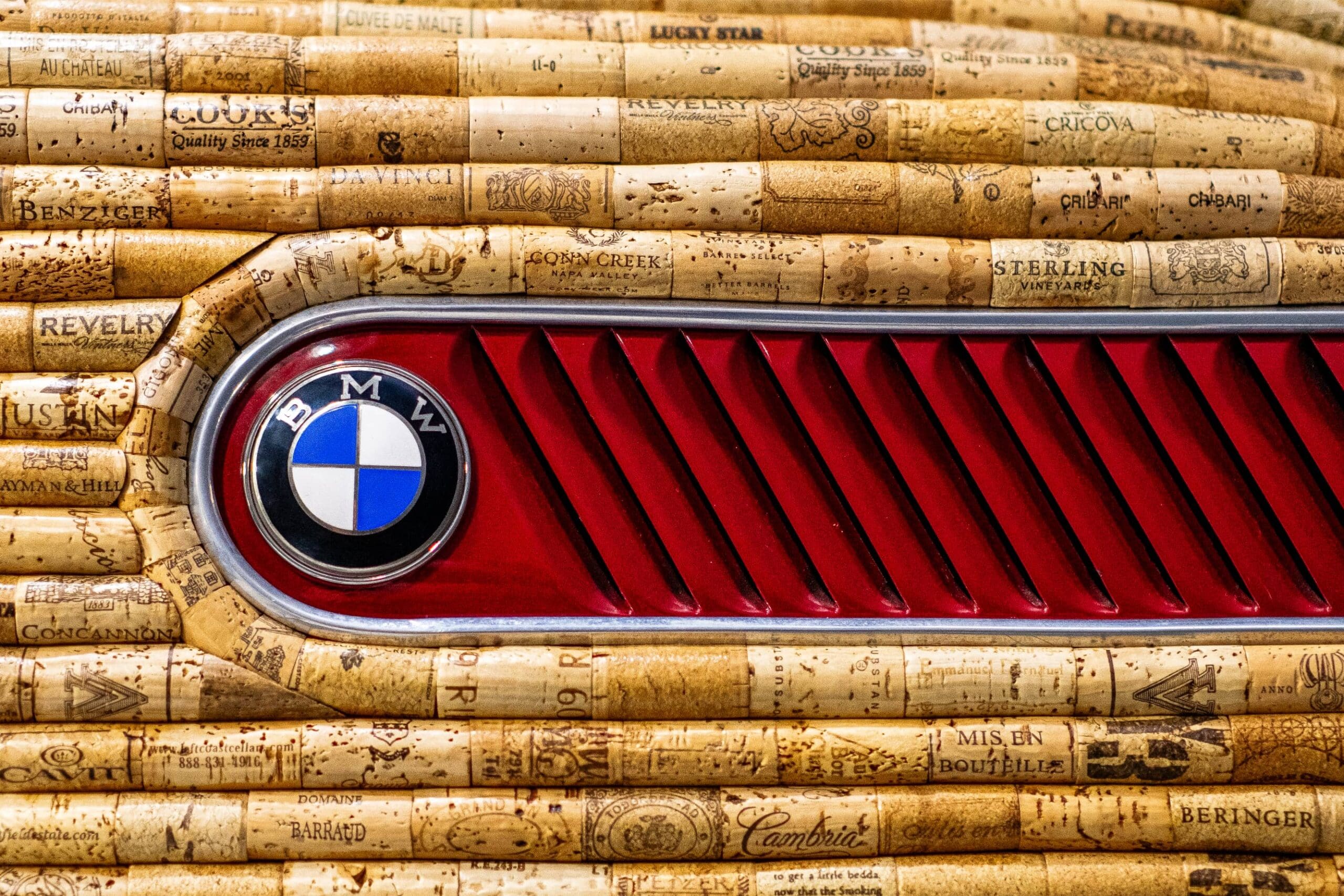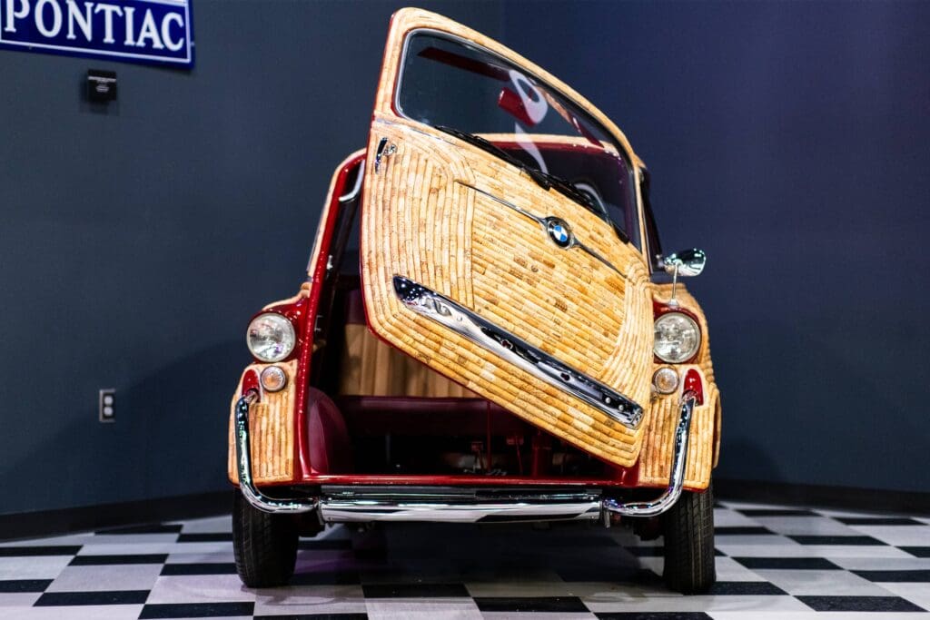 The BMW 600 is similar to the Isetta but enlarged to fit a whole family. A lengthened wheelbase and body allowed for a four-seat configuration and extra door, but the expansion made the car larger and heavier, so a new power plant was added to compensate. The name “600” refers to the 582-cc twin-cylinder engine (derived from the R67 motorcycle), which had a top speed of 62 mph. BMW’s first postwar, four-seat, economy car, the 600, led to the creation of the successful BMW 700. Duane Suanders, owner, said, “About a year after I finished corking the Isetta and halfway through corking my map of Europe, my 1958 restored BMW 600 was calling out to be corked. I decided to dust off the Dremel tool and get to work…..I must have improved my corking technique, because I completed my second corked classic in only seven months! The 600 used about 3,000 corks, and I enjoyed the creative challenge. I have displayed my corked 600, along with the corked Isetta, at several car shows, art shows and wine festivals over the last few years. The favorites in my collection are the corked cars, for obvious reasons.” Duane has lent his 600 to be displayed alongside the BMW Isetta he sold to MDCC in 2018. On loan from Duane Saunders.