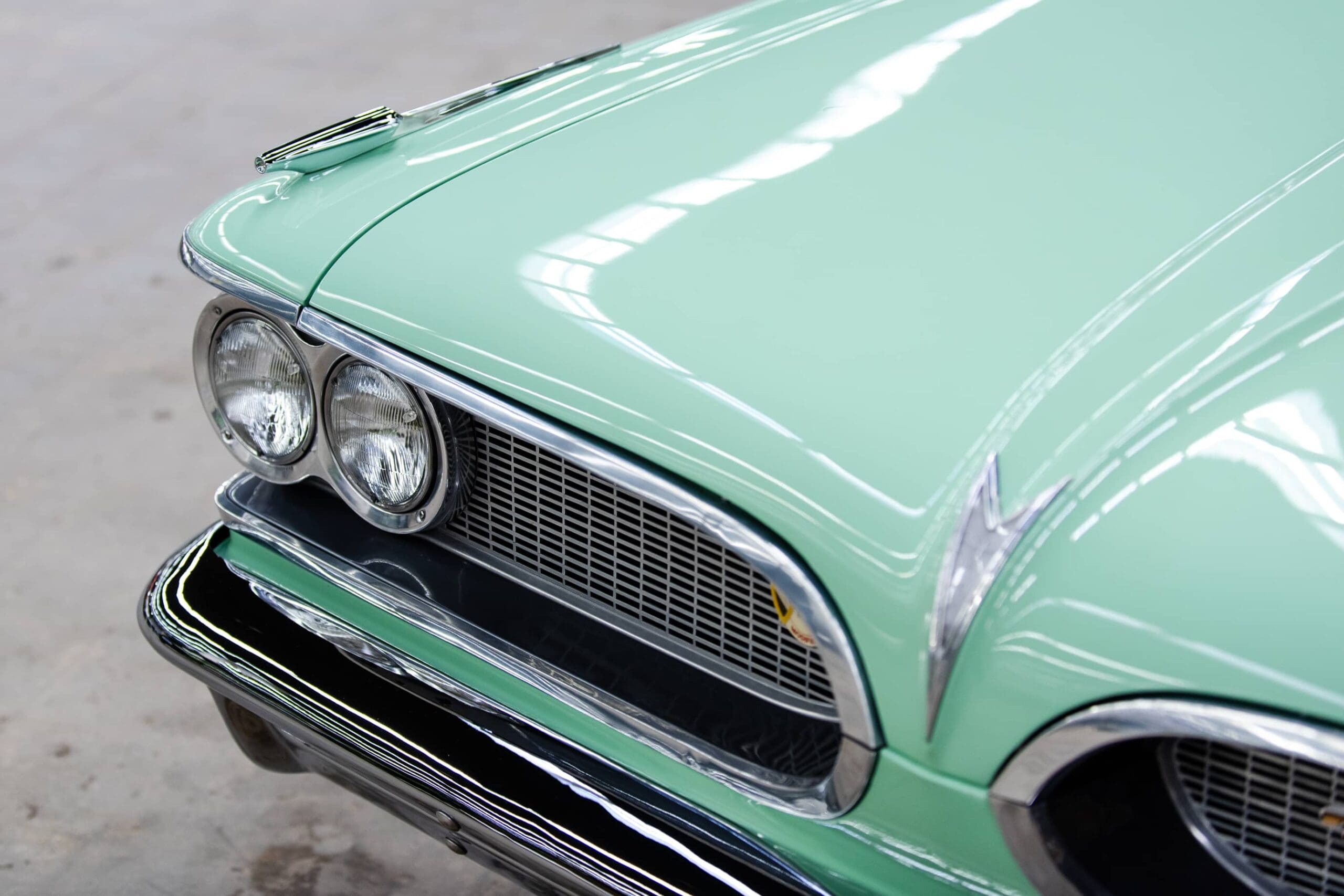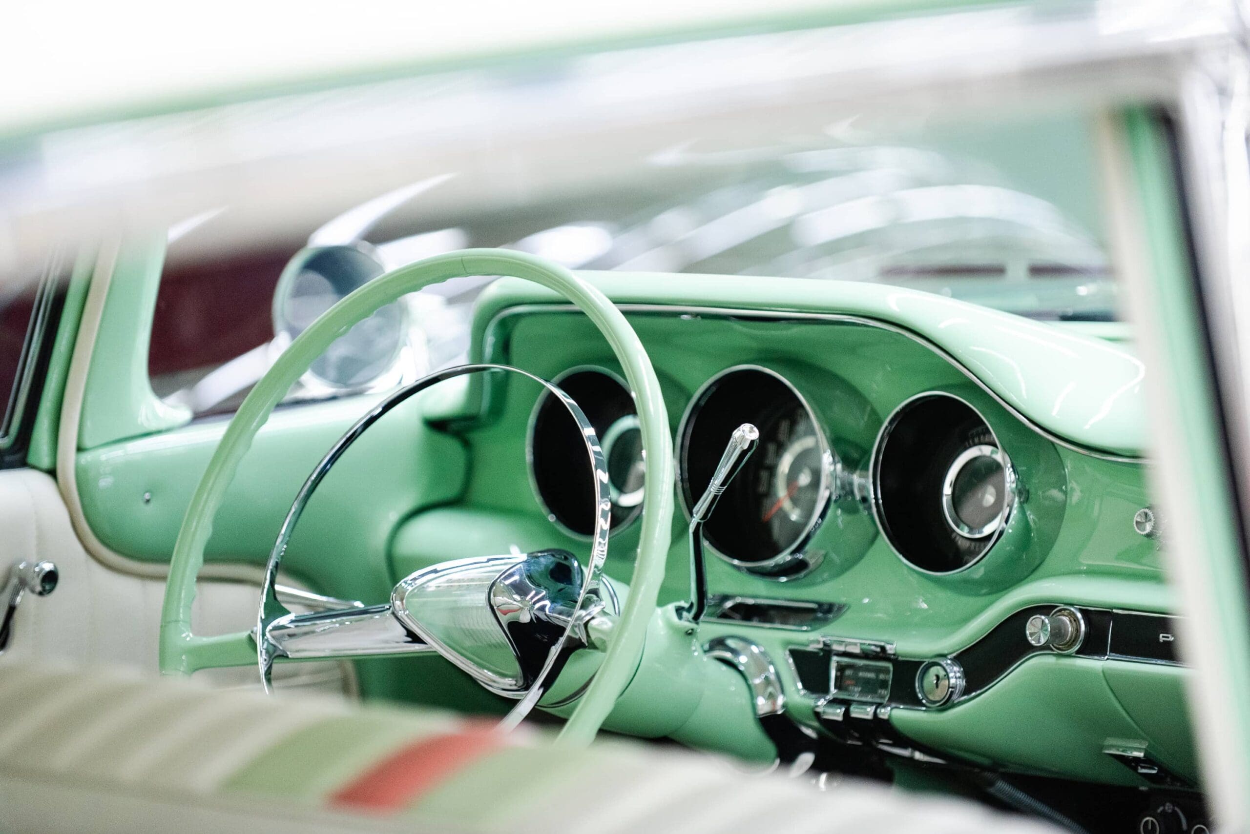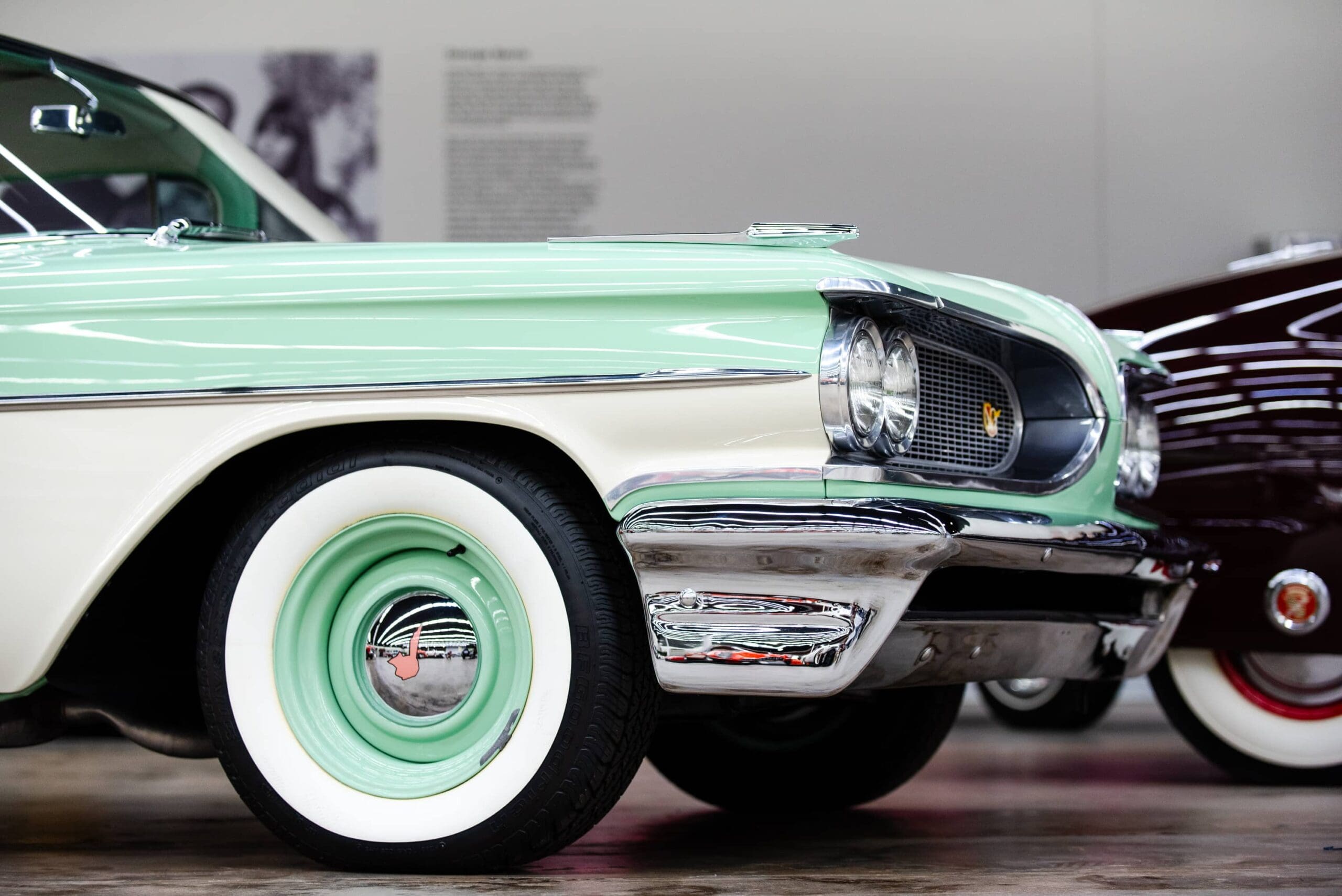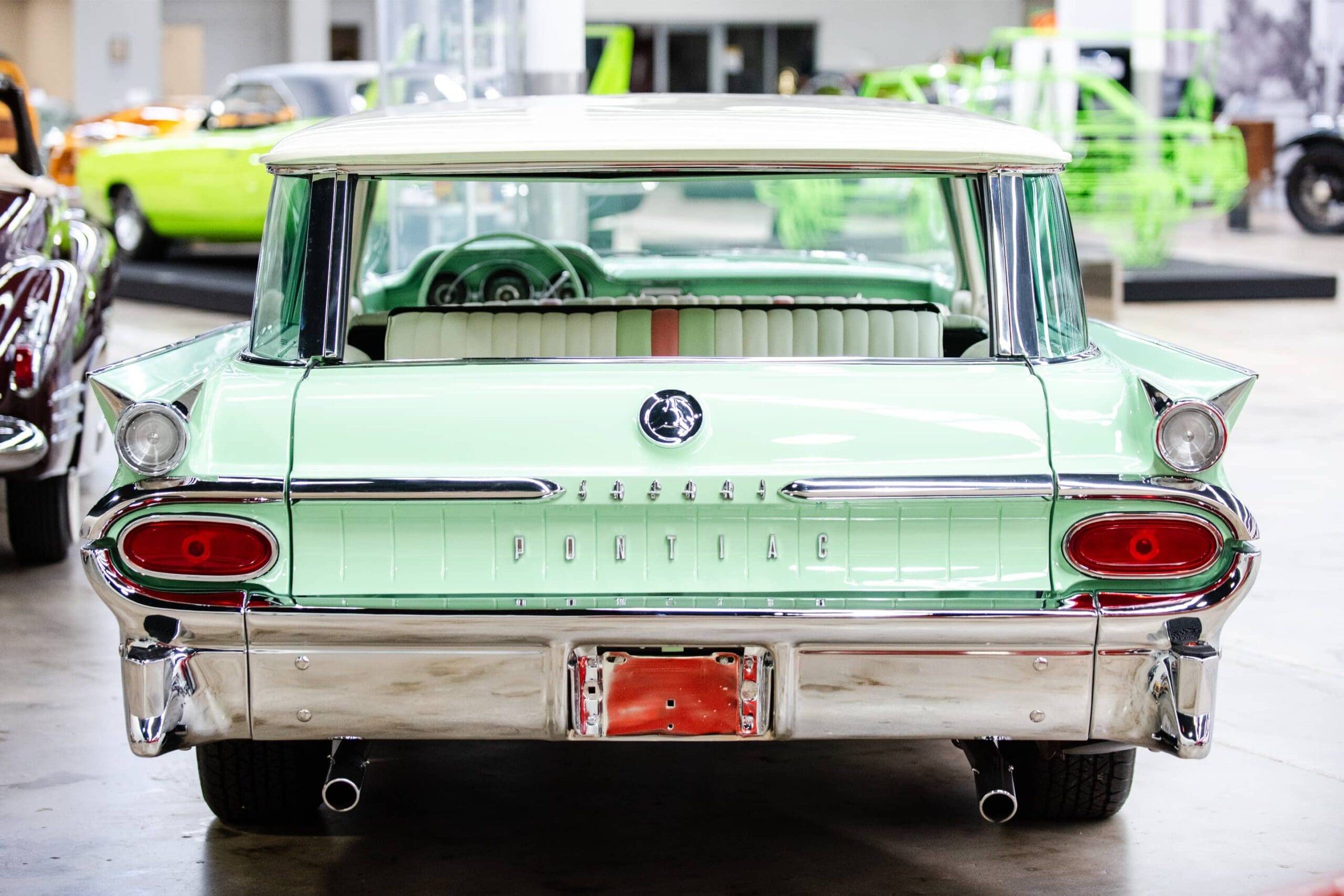 The Pontiac Catalina Safari station wagon at the Midwest Dream Car Collection features some mild customization while maintaining the feel of what rolled off the assembly line back in 1959. The exterior sports a two-tone mint green and ivory finish which screams 1950s and is highlighted by a custom tri-tone vertically pleated interior in ivory, mint green and coral vinyl. Our Safari wagon also features the flip-up rear facing third row seat which was a popular option at the time. All 1959 Pontiacs were powered by various renditions of the new 389 cubic-inch Tempest V8. This car maintains its original 389 engine which is mated with the optional factory correct “Tri-Power” triple two-barrel carburetor set-up yielding an impressive 330 horsepower. Modern updates include disc brakes, and aftermarket air conditioning.