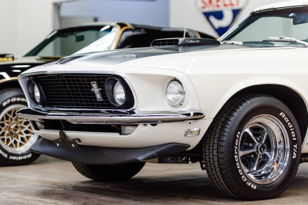 This Ford Mustang Mach 1 “R Code” features a Wimbledon white/black vinyl color scheme. The R Code also includes a 428-CID Cobra Jet V-8 engine and a four-barrel carburetor. This car has 335 brake horsepower and 440 foot-pounds of torque.