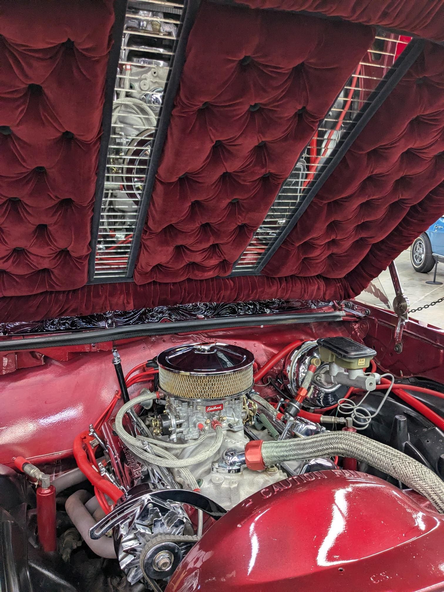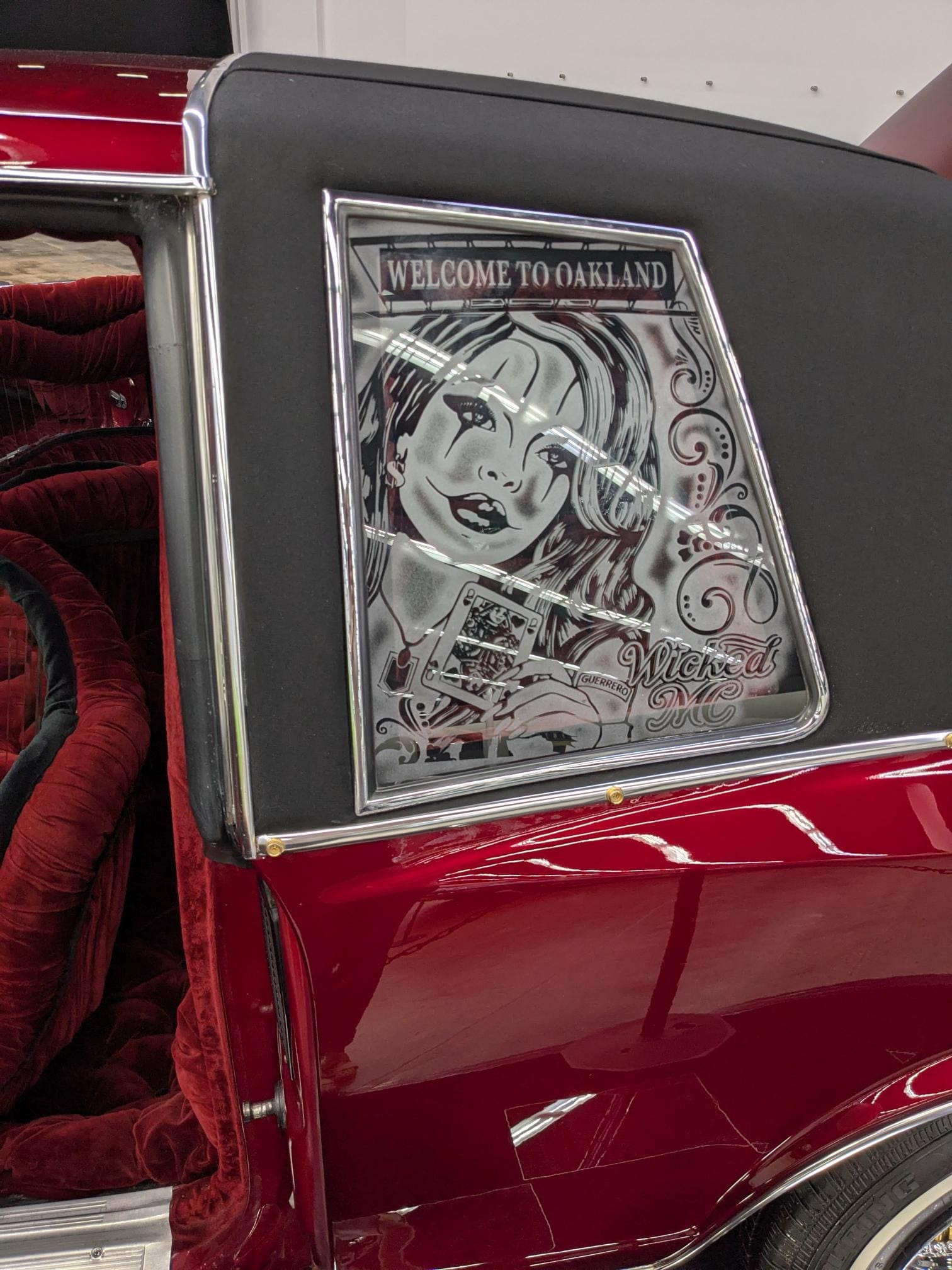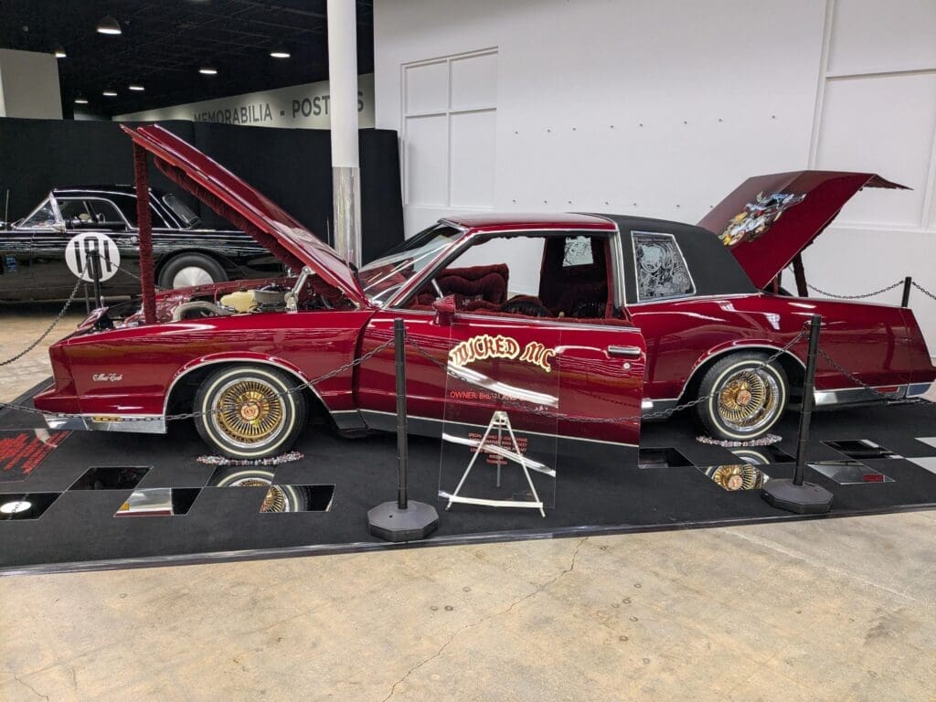 Originally a factory maroon coupe with a 305 engine, vinyl top, and matching interior, it has been reimagined in true lowrider fashion. The exterior now gleams in Candy Brandy Wine layered over a gold base, complemented by a wine-colored interior with black trim. The 350 small-block V8 is painted to match the body, while a custom mural—airbrushed from a late-1990s photo—adds a unique personal touch. Additional artistry includes sandblasted etching on the headlights and side windows. The Monte Carlo rides on classic 13×7 Zenit wire wheels and features a two-pump hydraulic system powered by four marine deep-cycle batteries, allowing the car to hop, dance, or cruise low and slow.