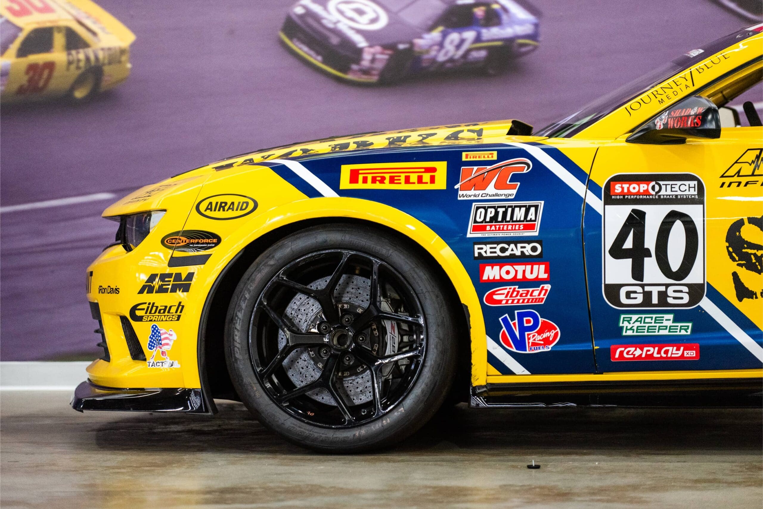 This Camaro Z28 was raced by Geoff Reeves in the 2015 Pirelli World Challenge in the GTS category. This number 40 car raced alongside another Camaro, the number 20 car. Geoff was a Navy Seal for 9.5 years then began working as a brand liaison for car companies and fell in love with racing. After training at driving schools, like Bondurant (decal on car), he received a sponsorship from the Camaro team and began racing professionally. Originally running the Continental Tire SportsCar Challenge series in 2014, he moved into the Pirelli World Challenge in 2015. Geoff’s favorite part of the Pirelli World Challenge is the broad variety of cars in the race, and the ability to race through the streets of such amazing cities. Racing through the heart of St. Petersburg, and places like Long Beach, and going to the world’s most amazing road courses including Sonoma, Mid-Ohio, and Laguna Seca. He also enjoys the use of real car bodies in racing because you can see the exact same car driving through the streets of your home town. Reeves is a Corvette enthusiast, so he is extremely proud to have been in the Chevy family, racing a Camaro.