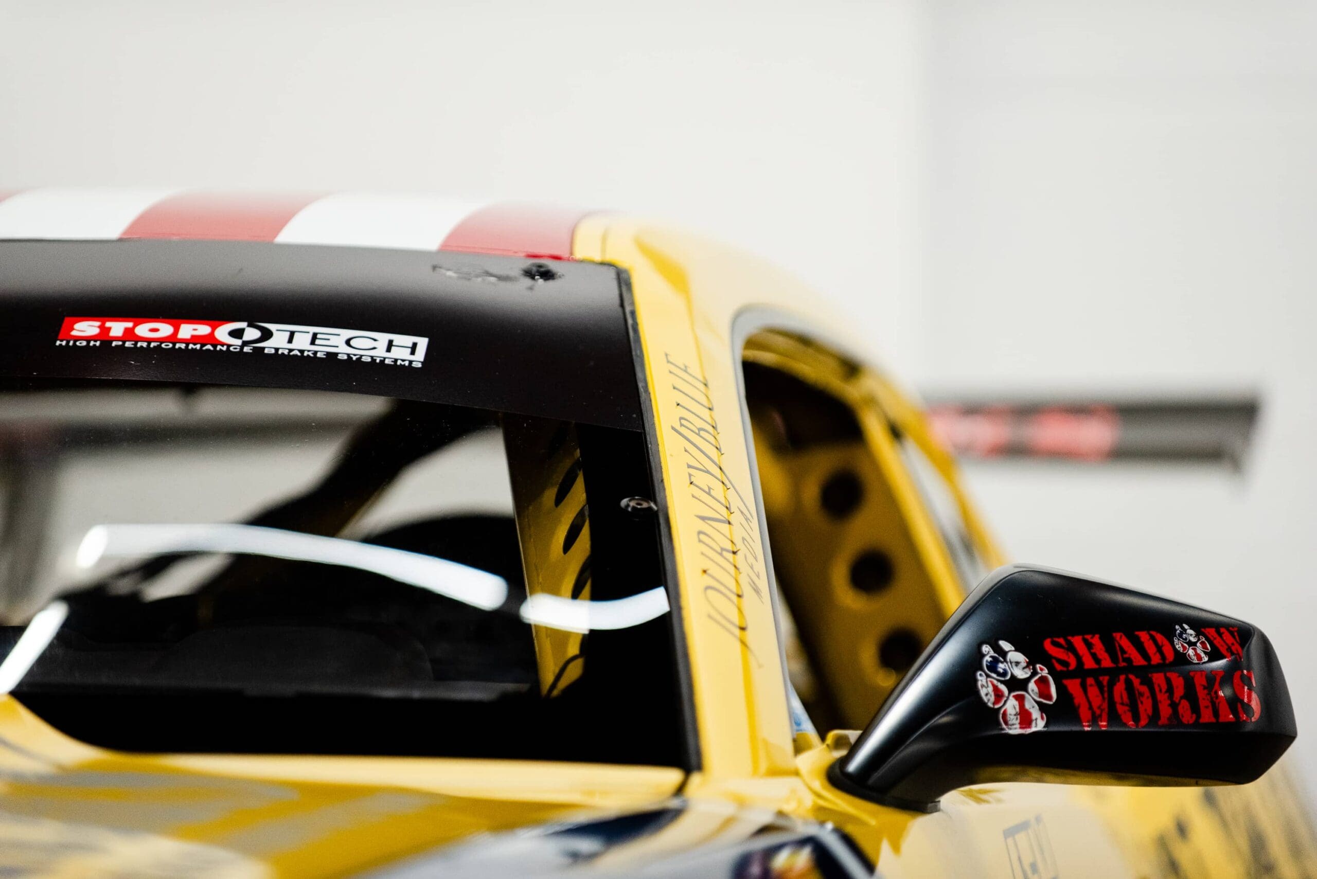 It originally started out as a student car at the Arizona-based race school Bondurant. For whatever reason the airbag blew on the wheel and the school didn’t want to replace it. The team owner made a deal to buy it and its sister car for $1 and promote the school through its racing. (The sister car was DESTROYED when it was raced in the Trans Am series and was hit…BAD).