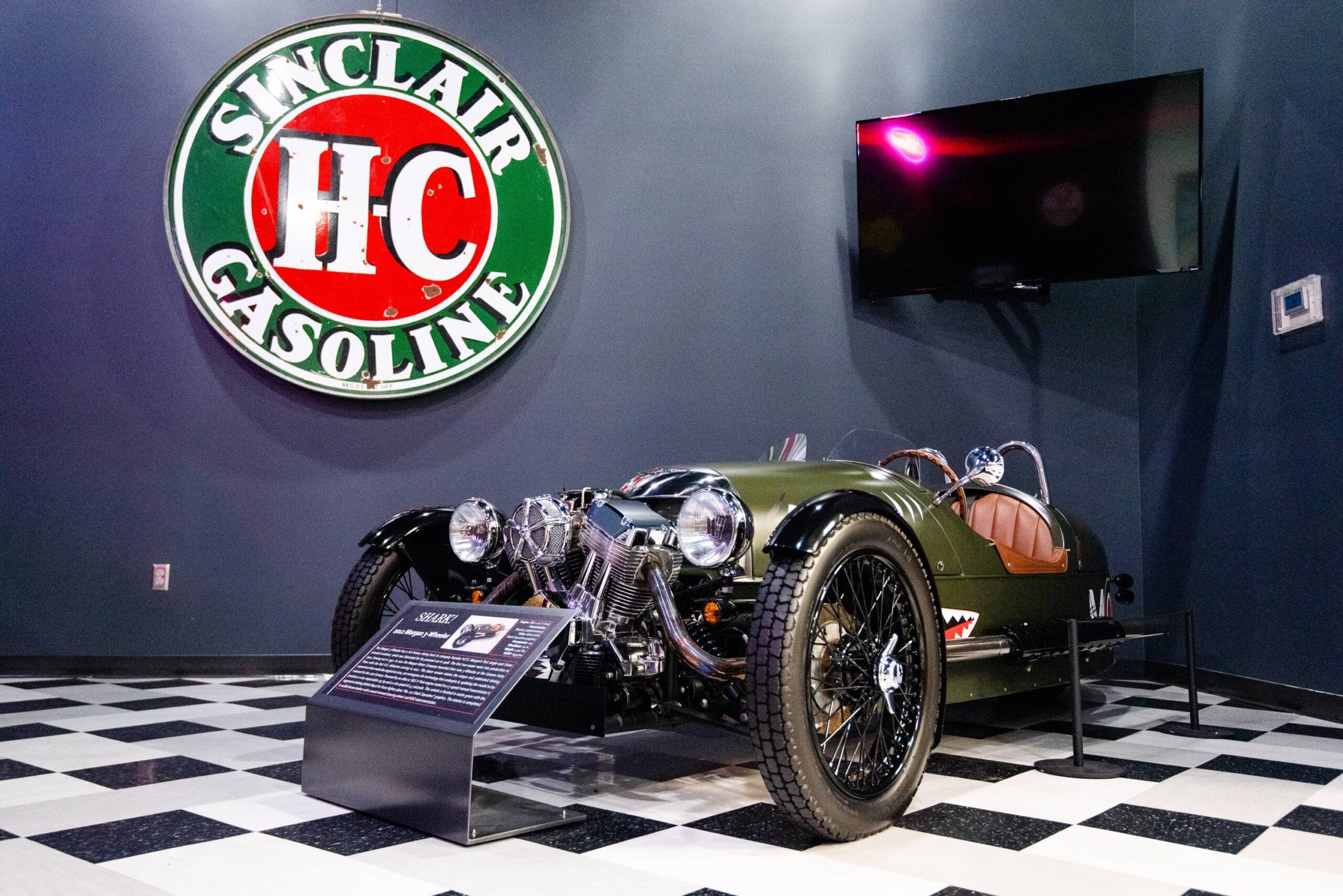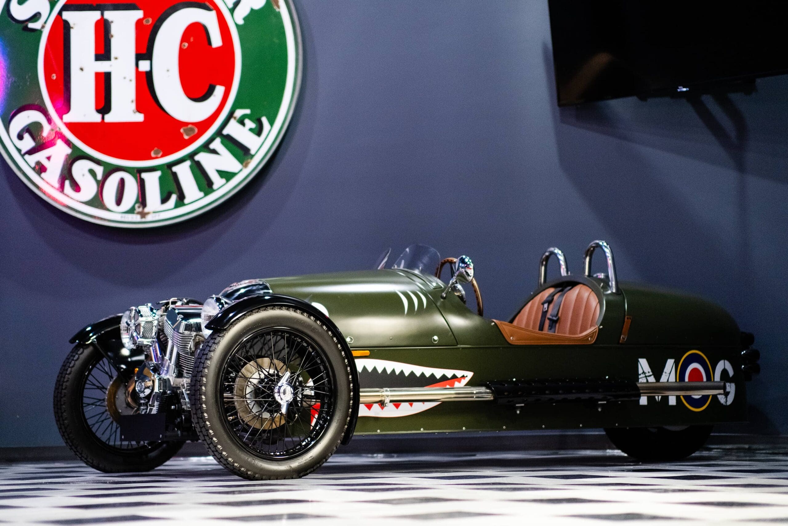 The Morgan Motor Company, founded in 1910 by Henry Frederick Stanley Morgan, is a British motor car manufacturer headquartered in Malvern, Worcestershire, United Kingdom.The history of the Morgan 3-Wheeler dates back to the company founders first single-seat three-wheeled runabout, which was fabricated for his personal use in 1908. The first two-seater went into production in 1911, and continued until bowing out in 1952. Technically classified as a motorcycle this vehicle captures the feel of an automobile, airplane and motorcycle all rolled into one. The Morgan 3-Wheeler on display at MDCC is finished in a matte green with Royal Air Force fighter plane “Shark Squadron” graphics giving the Morgan a very aggressive look. The saddle brown leather interior, wood rimmed steering wheel and fighter plane inspired gauges and switches round out the package. The background history on the fighter plane graphics dates back to WWI and a highly decorated English fighter pilot by the name of Albert Ball VC. As an original Morgan 3-wheeler owner, Ball famously surmised that driving his Morgan was the closest experience to flying without leaving the ground. In 2011 the Morgan Motor Company launched their new 3-Wheeler at the Geneva Auto Show with the first U.S. deliveries arriving in 2012. Unique to Morgan vehicles is that for over a century they have been constructed using ash wood as one of the core elements, a practice that continues today in the framing of the bodies. This latest version retains the unique and celebrated driving experience that made the original an icon, yet reimagines the technology that underpins it, updating the model to be relevant for the 21st Century. Powered by an 1800 cc S&S V-Twin engine mated to a 5-speed manual transmission it produces a very respectable 115 hp and a 0-60 speed of 4.5 seconds. To quote Morgan-Motor.com “The Morgan 3 Wheeler is a rebellion against sanitised, modern motoring.” You will want to check out the 3-wheeler in person to truly capture what a fun vehicle it is!